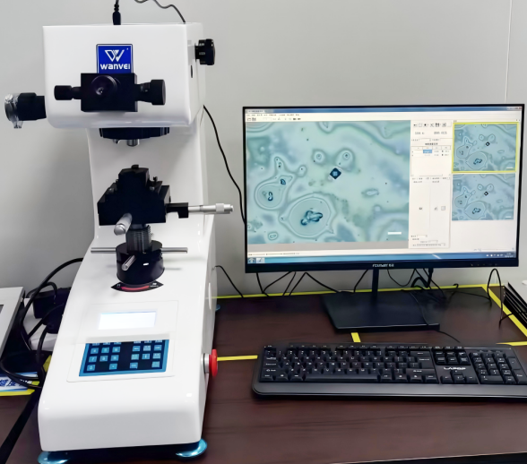 数显显微维氏硬度计 主要是测量金属、陶瓷等材料的显微硬度,通过在样品表面压出一个微小的菱形压痕,再配合电脑软件自动测量压痕的对角线长度,从而计算出材料的硬度值。 广泛应用于精密加工、模具制造、五金电镀等行业,尤其适合检测薄工件、表面涂层或微小零件的硬度。